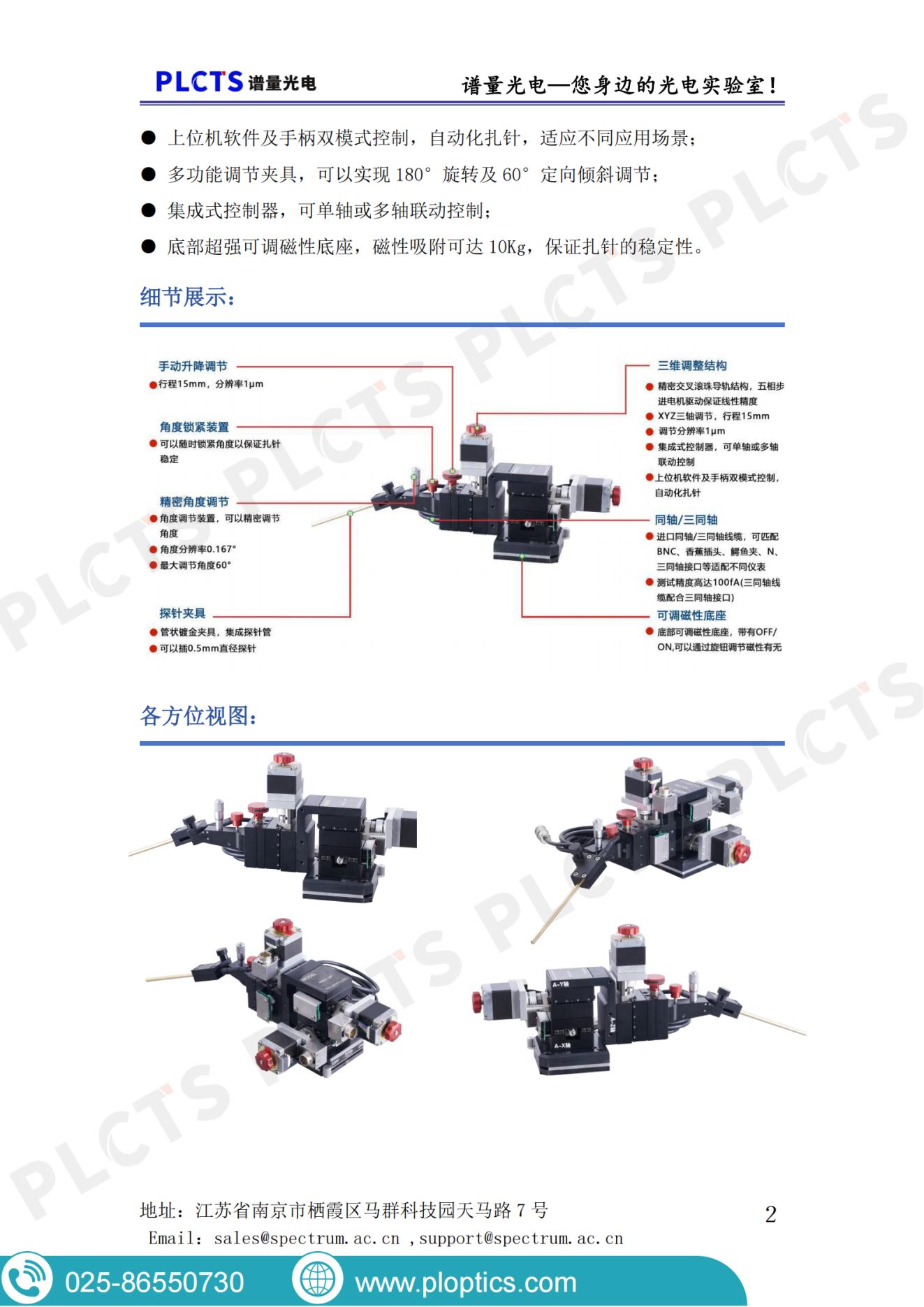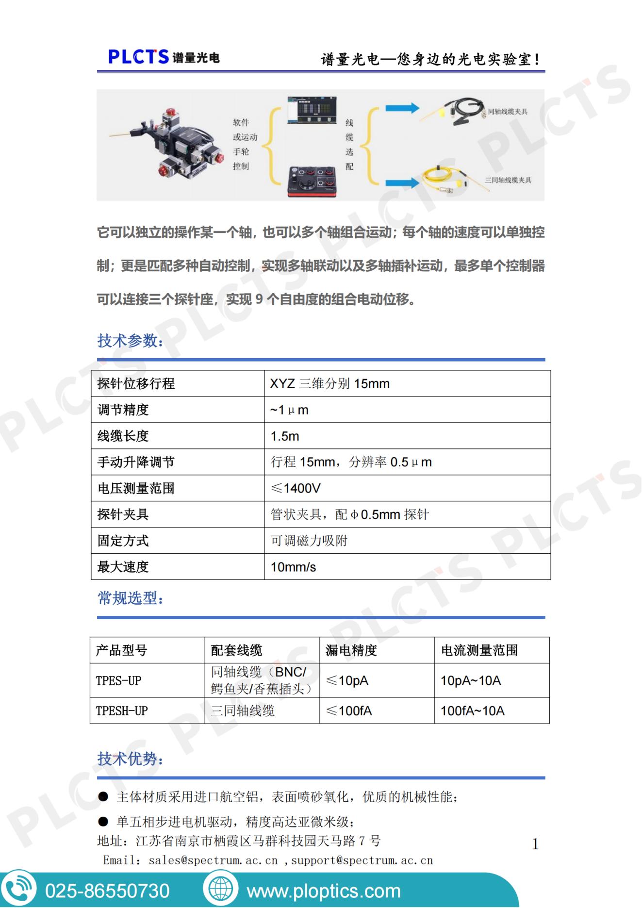 谱量光电提供高精度电动探针座(TPES-UP系列)产品手册下载,位移精度可达1μm,适用于半导体、材料科学等领域对精密探针操作有严格要求的实验。