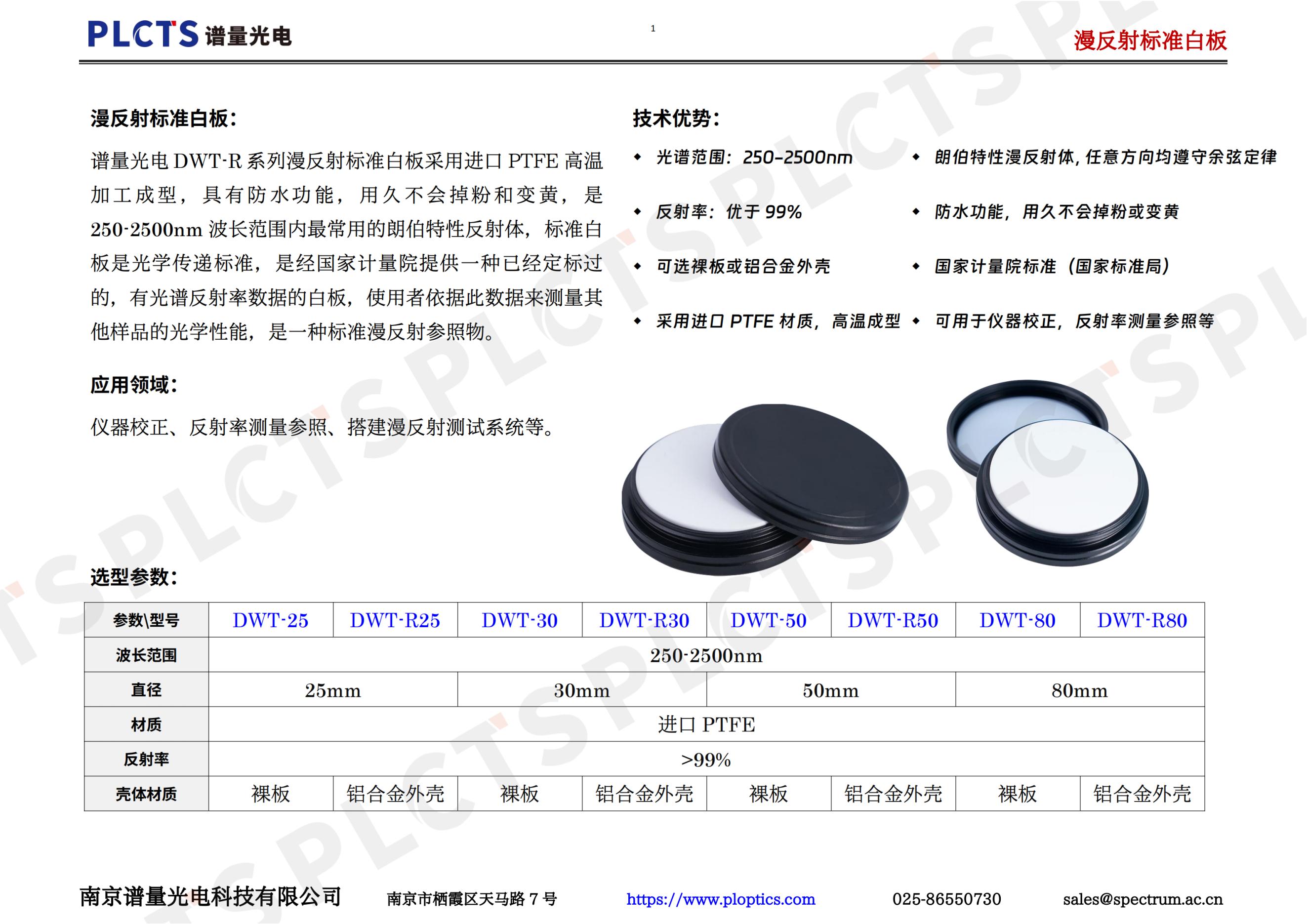 谱量光电提供DWT系列漫反射标准白板产品手册下载,采用进口PTFE材料制造,用于精准光学测量与校准。