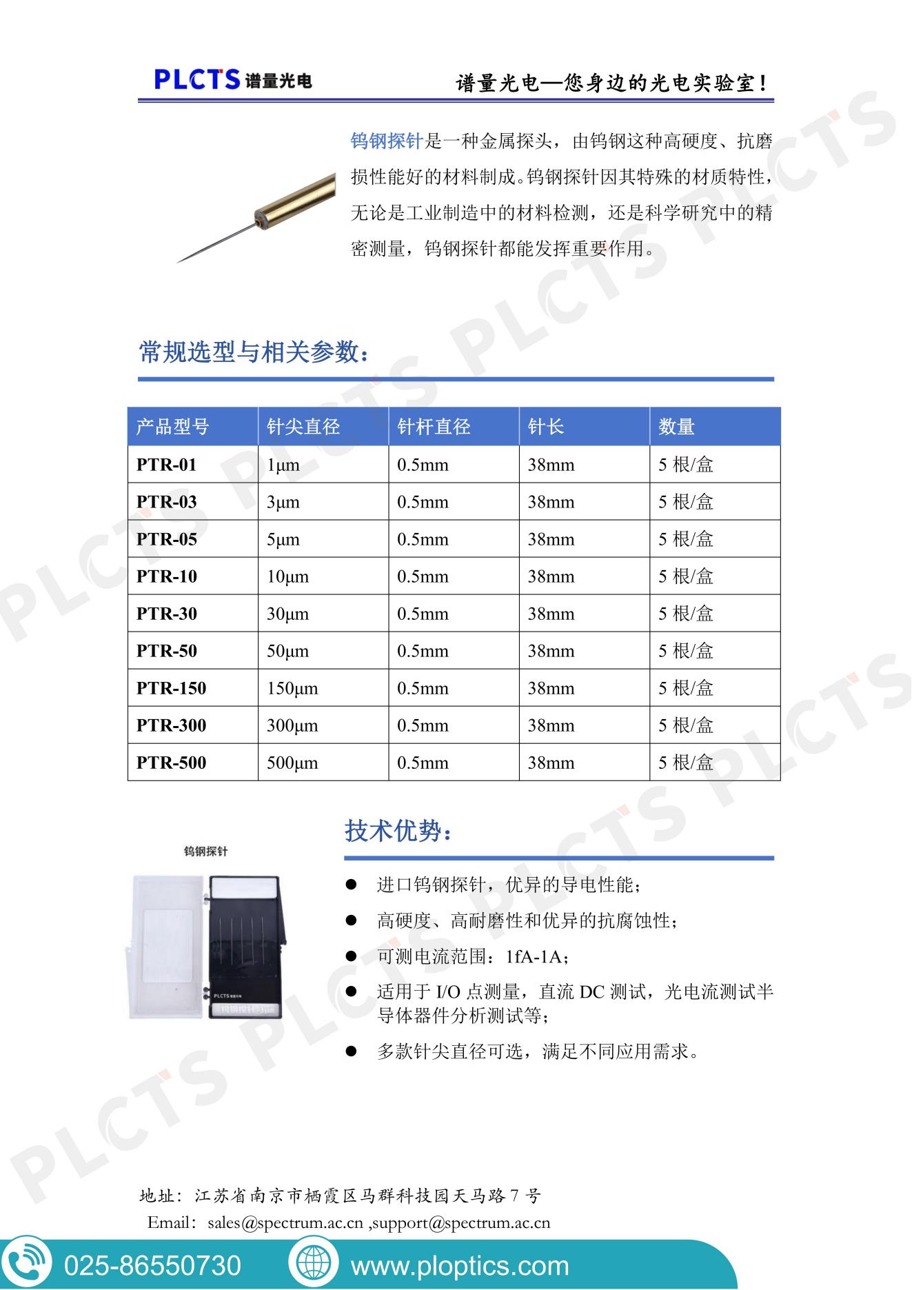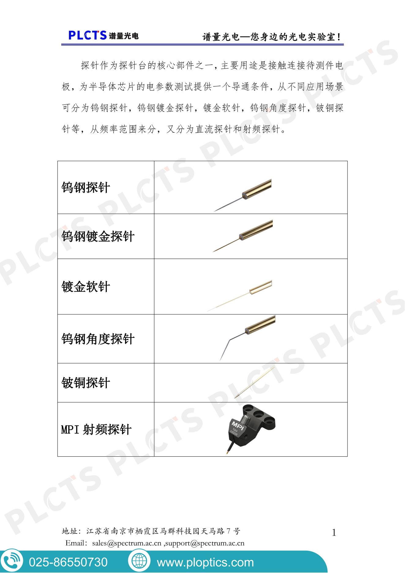 谱量光电提供钨钢、镀金、铍铜等多类型直流探针及MPI射频探针,适用于半导体器件电学测试与探针台配套使用。可下载探针综合产品手册查看详情参数。