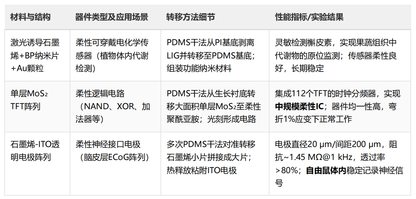 自2020年以来微操控干法转移技术在二维材料柔性电子应用中焕发新机遇,催生了一系列新颖器件和应用场景。表格汇总了部分代表性研究: