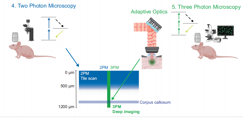 深层组织成像(>1 mm深度)的难题在于光的散射和衰减。两光子显微一般在大脑皮层300–700 µm左右逐渐力不从心。近年最大的突破来自于三光子显微技术,配合优化的飞秒激光光源,使在毫米级深度的活体成像成为可能。