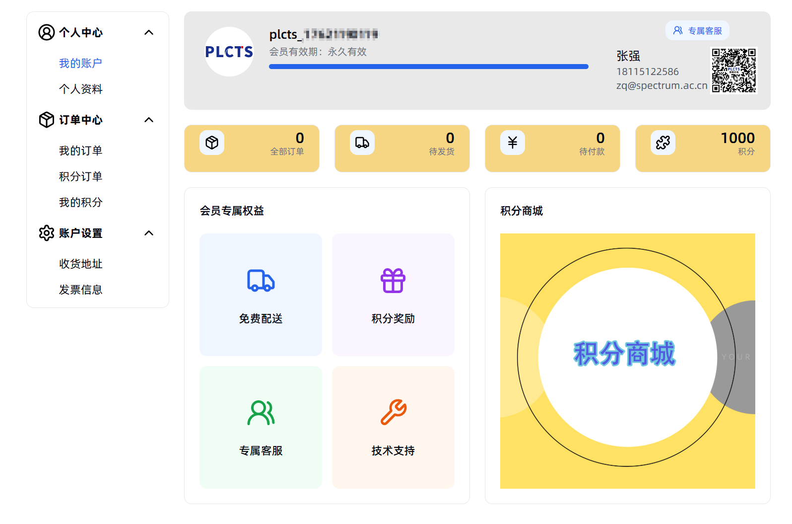 账号个人中心页面,可查看订单信息,设置收货地址,发票信息,查看谱量商城积分,若有任何疑问可直接扫码添加专属客服