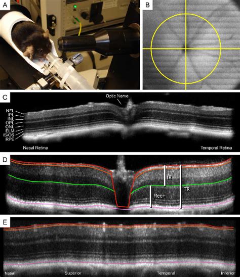 图注:SD-OCT在小鼠视网膜成像中的应用示例,展示了多层结构分辨与定量测量能力。