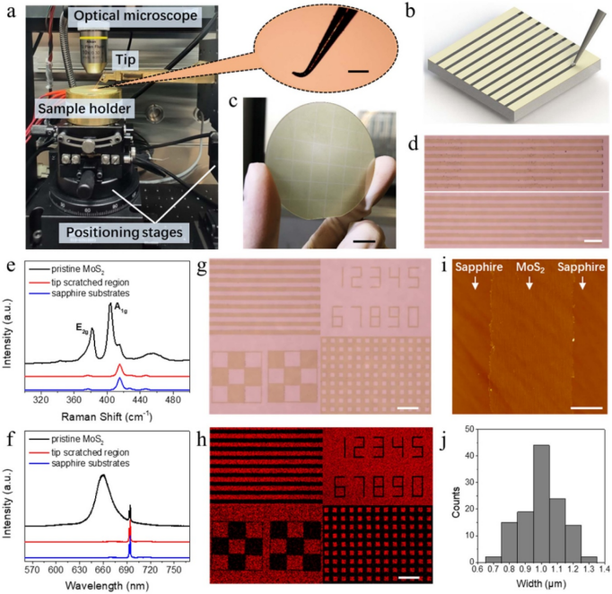 ↑上图为划刻光刻法(scratching-lithography)制备晶圆级二硫化钼(MoS₂)单层的整个实验过程、原理以及结果