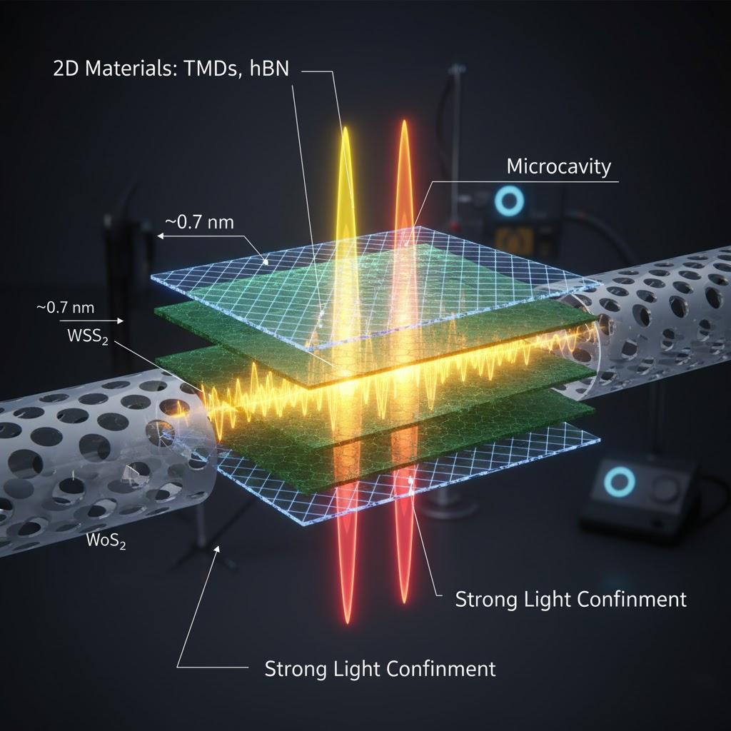 而二维材料(2D materials)——如过渡金属硫属化物(TMDs,MoS₂、WS₂、WSe₂ 等)和六方氮化硼(hBN)——凭借其原子级厚度、高激子结合能与直接带隙,成为理想的光学活性层。当这些二维材料被“嵌入”微腔之中,就能在极小体积中实现极强光场调控,开启量子光学器件的新篇章。