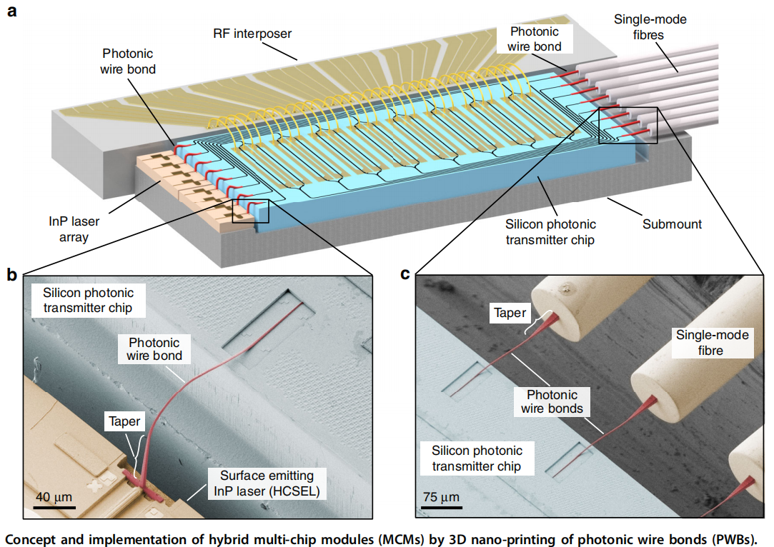 上图为3D 纳米打印 Photonic Wire Bond 在混合集成光子模块中的应用↑