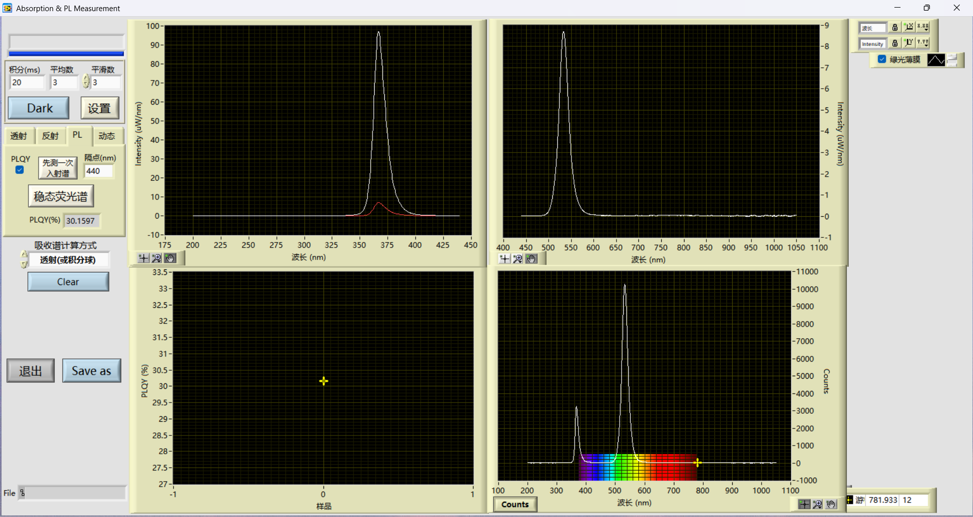 ↑该绿光薄膜 PL 测试非干净,荧光发射峰位于约 550 nm,峰形尖锐,背景噪声低,PLQY ≈30% 属于绿光材料自然表现。