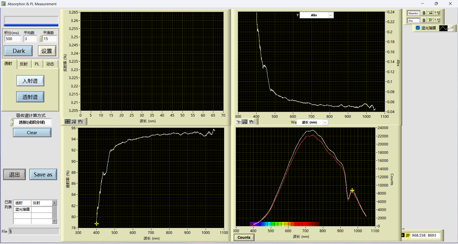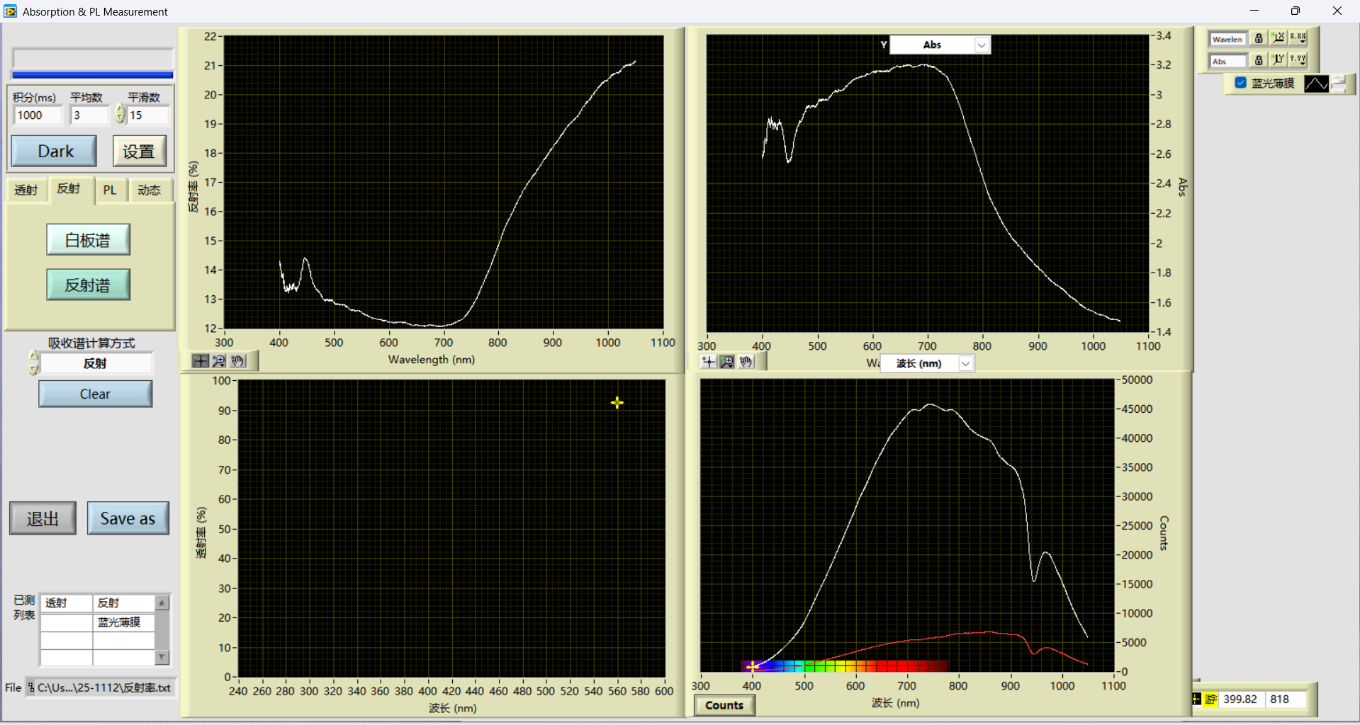 蓝光薄膜反射率光谱测试(软件实时采集界面)↑