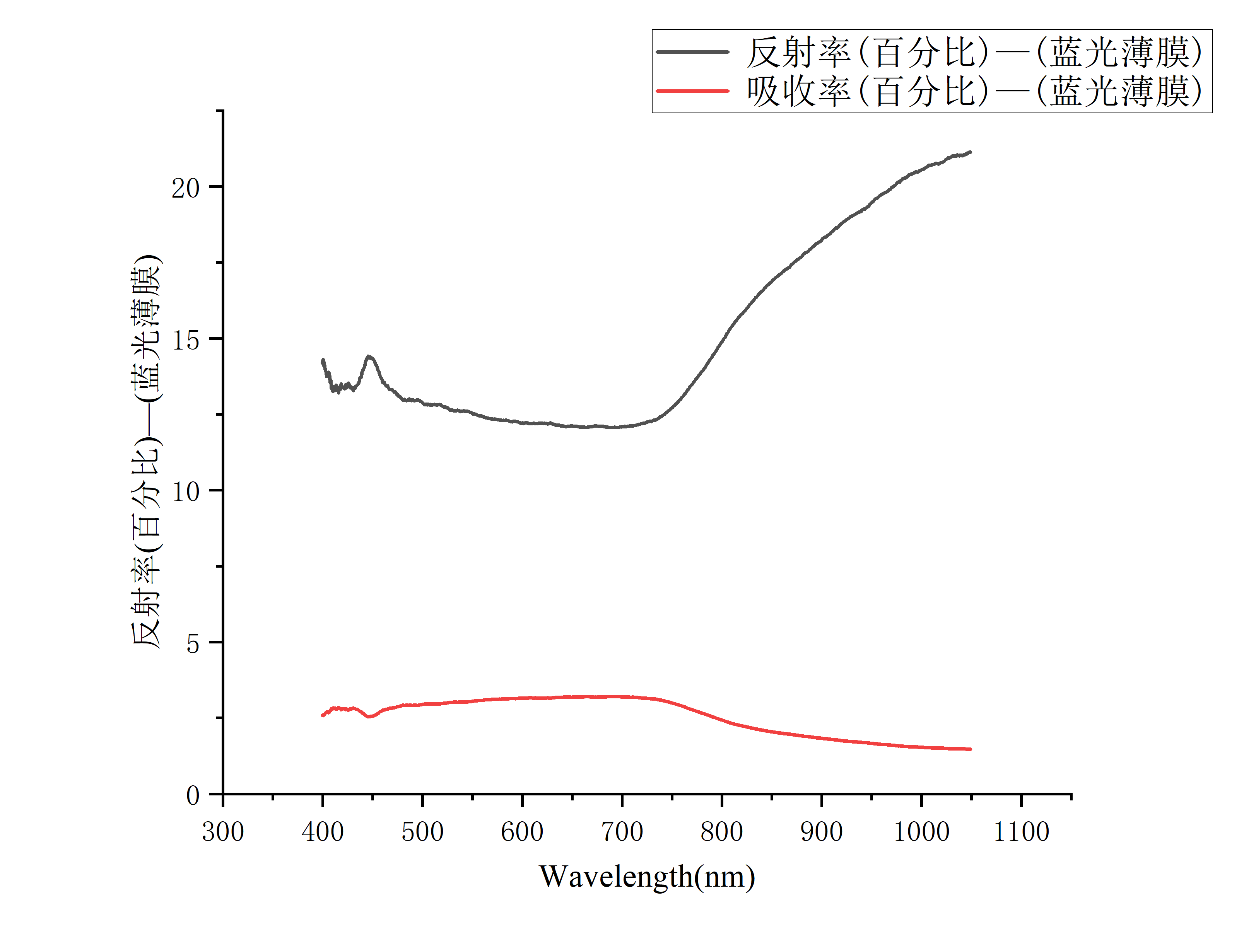 蓝光薄膜的透射率与吸收率光谱测试(由导出数据绘制)↑