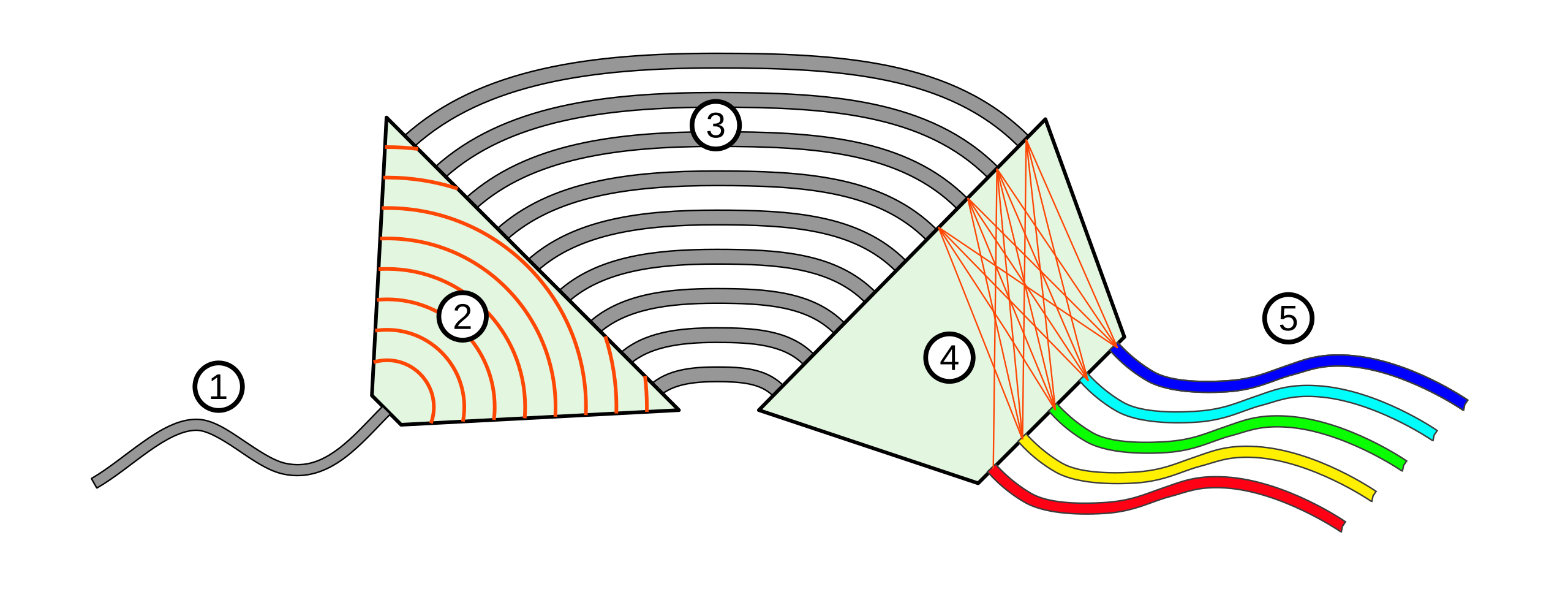 AWG 利用阵列波导的光程差将不同波长转换成空间位置上的差异,从而实现波长的分离,反过来AWG也可以进行不同波长的合束。↑