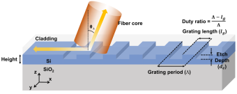 光栅耦合(Grating Coupler)示意图。通过在硅波导表面刻蚀周期性结构,使光纤斜入射的光束耦合进入波导模式。↑