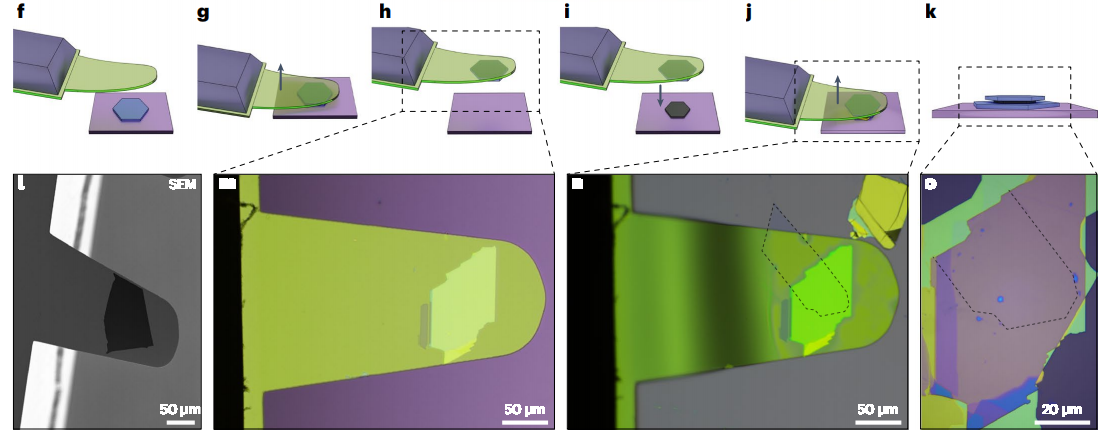二维材料异质结构的转移与组装示意。二维材料器件通常并非直接原位形成,而是通过片层拾取、对位、转移和层层堆叠完成集成,最终的界面洁净度、层间耦合与结构完整性会直接影响器件质量。