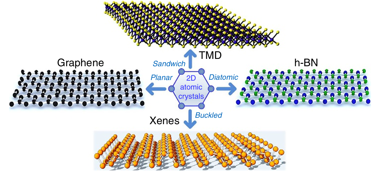 具有代表性的二维原子晶体结构分类。展示了平面(Planar)、三明治(Sandwich)及褶皱(Buckled)等典型结构。这些原子级的薄片通过独特的形变缓冲机制(如褶皱伸展或层间滑动),在柔性电子应用中实现了力学顺应性与电学功能的深度融合。