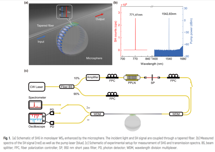 研究者将单层 WS₂ 精准放置在高 Q 石英微球腔表面,腔内形成强烈的“耳语廊模”(WGM)。在连续波激发下,二次谐波信号较裸片增强 1.46 × 10⁷ 倍,并实现 MHz 级输出速率。