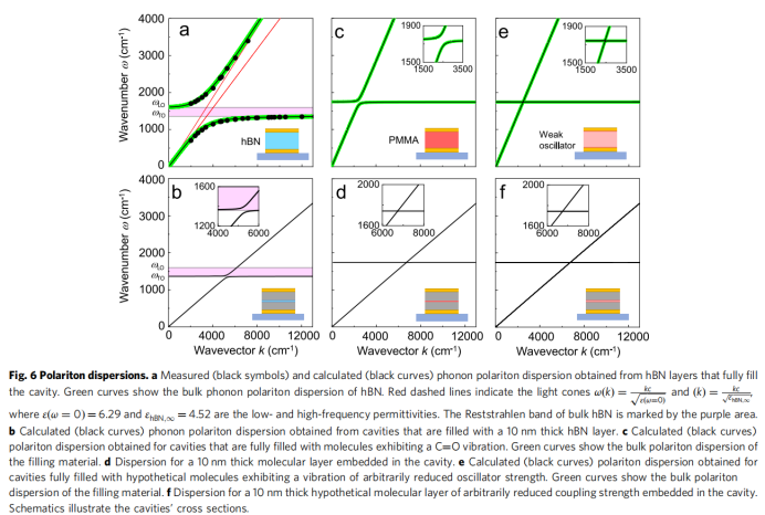 不同腔体配置下,六方氮化硼(hBN)或填充材料的极化子(Polariton)色散关系。