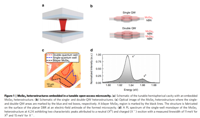 上面的图表描述了研究人员如何制备 (b、c) 高质量 (d) 的二维材料异质结构,并将其嵌入 (a) 一个可调谐的开放式微腔中,为研究二维材料中的基本光物理现象和开发新型光电器件奠定了基础。↑