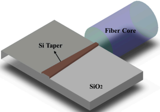 该图展示的是一个光纤到片上波导的光耦合结构,它通过使用锥形硅波导作为模式尺寸转换器↑