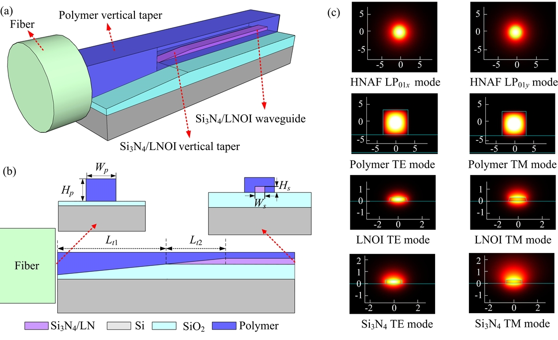 光纤发出的光首先进入聚合物渐变波导,在低折射率层中形成大模场,与光纤高斯模式匹配;随后光逐层耦合进入 Si₃N₄ / LNOI 波导中,模场逐渐收缩并被硅基波导强约束,实现平滑的模场渐变与低损耗耦合。