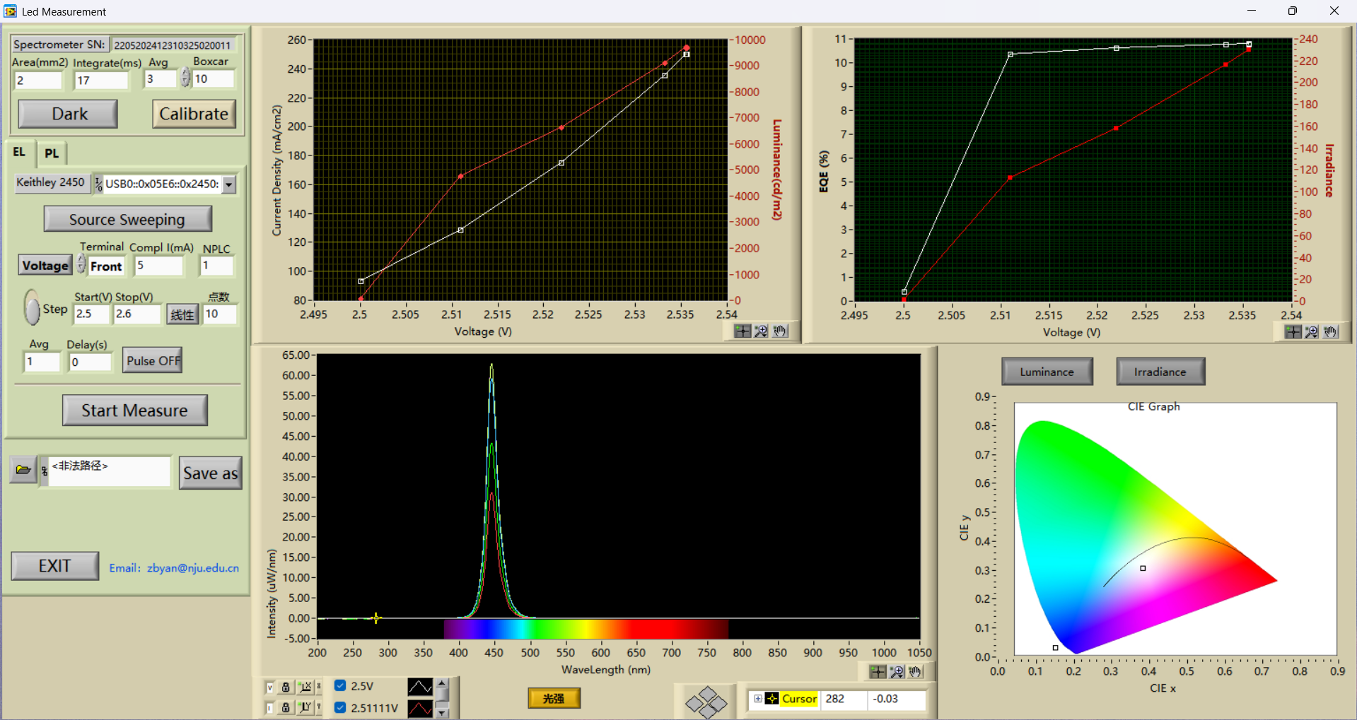 ↑该图展示了蓝光 LED 灯珠的电致发光特性,开启电压约 2.5V,EL 峰值约 450 nm,EQE ≈10%,光谱稳定,没有红移或多峰问题,色坐标落在标准蓝光区。