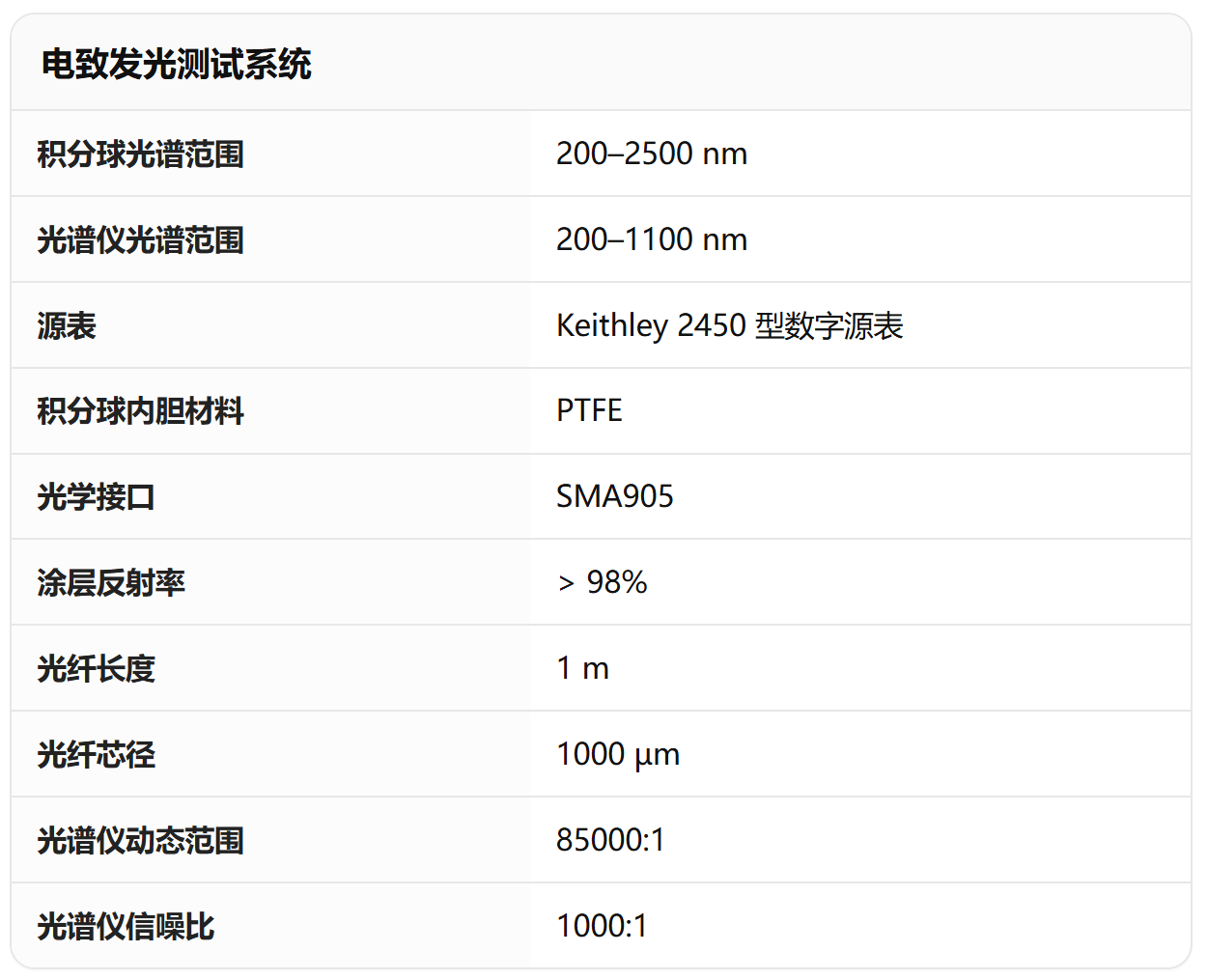 谱量光电光电测试系统采用模块化设计,集成光源、积分球、光谱仪、源表及测控软件等于一体,支持多类型样品测试。系统具备操作简便、数据准确、兼容性强等特点,适用于二维材料、量子点薄膜、OLED、钙钛矿、光电探测器等材料。
