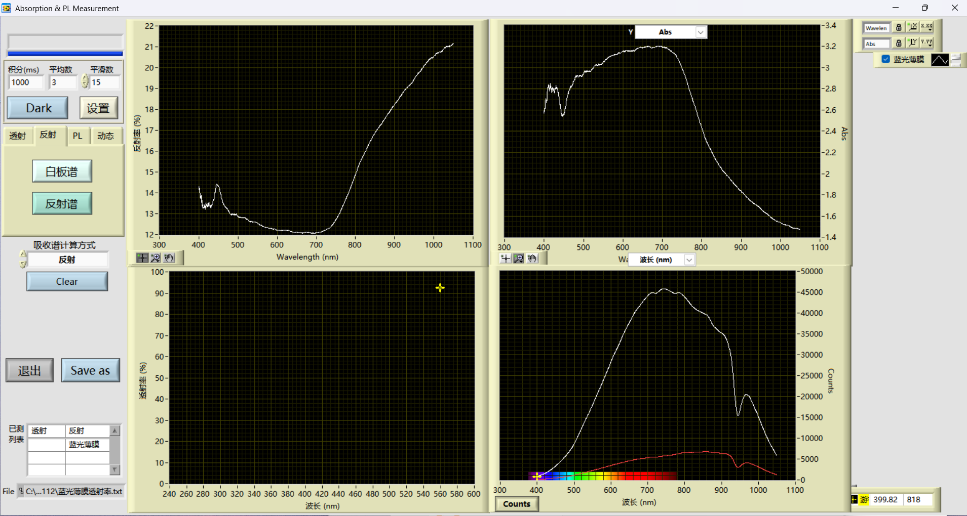 蓝光薄膜反射率光谱测试(软件实时采集界面)↑