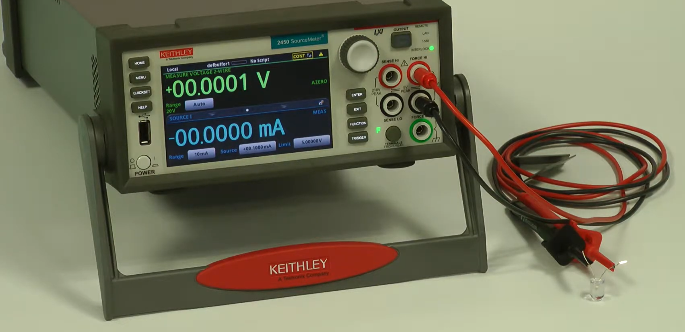 Keithley 2450 源表是一款集电压/电流源输出与高精度测量功能于一体的图形化源测量单元(SMU),可实现对器件电学特性的精确激励与同步采集。设备支持电压源、电流源及四线制远端测量模式,适用于半导体器件 I-V 特性测试、光电探测器性能评估及新型材料电输运研究等应用场景。