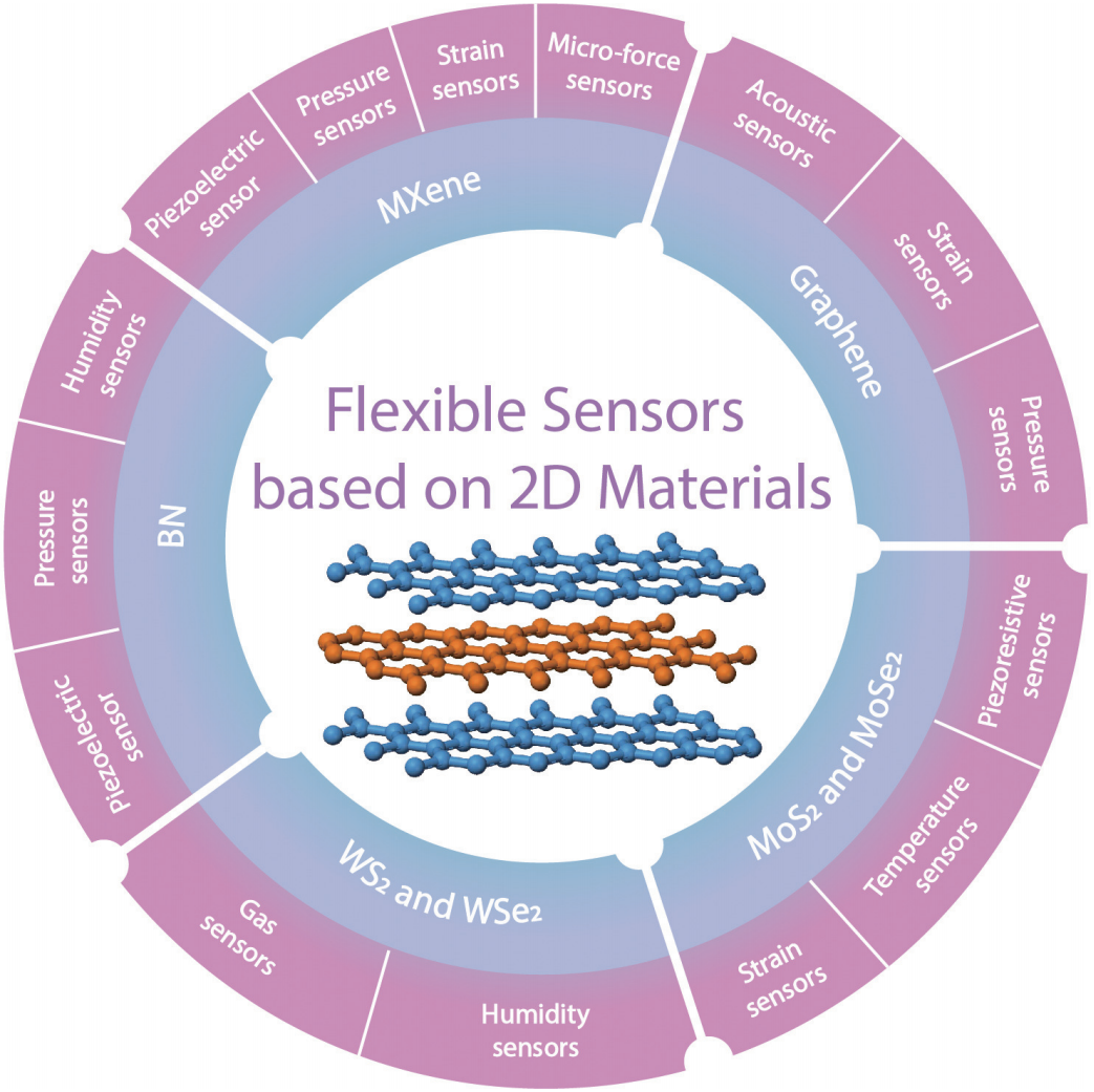基于二维材料的柔性传感器体系概览。 展示了石墨烯、MXene、过渡金属硫族化合物(TMDCs)等典型二维材料,及其在压力、应变、气体、温度等多种柔性感知领域的广泛应用。