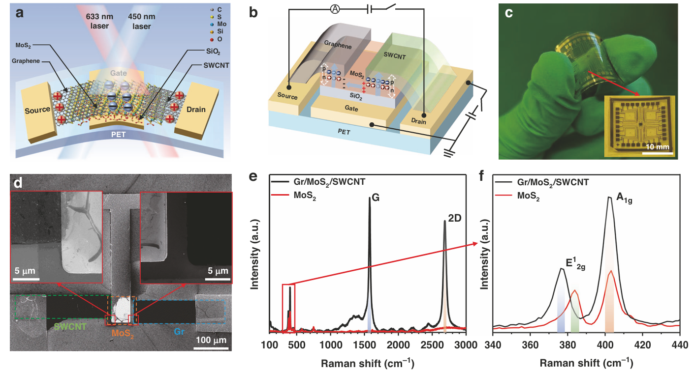 基于二维异质结的柔性光电探测器实例。 从微观的原子层堆叠原理(a、b)到宏观的可弯曲阵列实物(c),该研究展示了如何利用石墨烯与二硫化钼等二维材料构建高性能、高柔性的光电芯片。拉曼光谱(e、f)进一步证实了异质结界面的高质量原子级构筑。