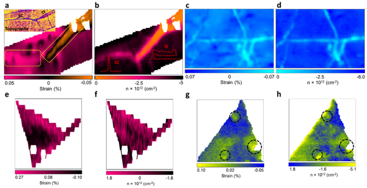 石墨烯与MOS2缺陷区域的应变与掺杂分布映射图。包含机械剥离与CVD样品的对比分析,揭示了褶皱、折叠等结构缺陷对材料局部电子特性的调控规律。