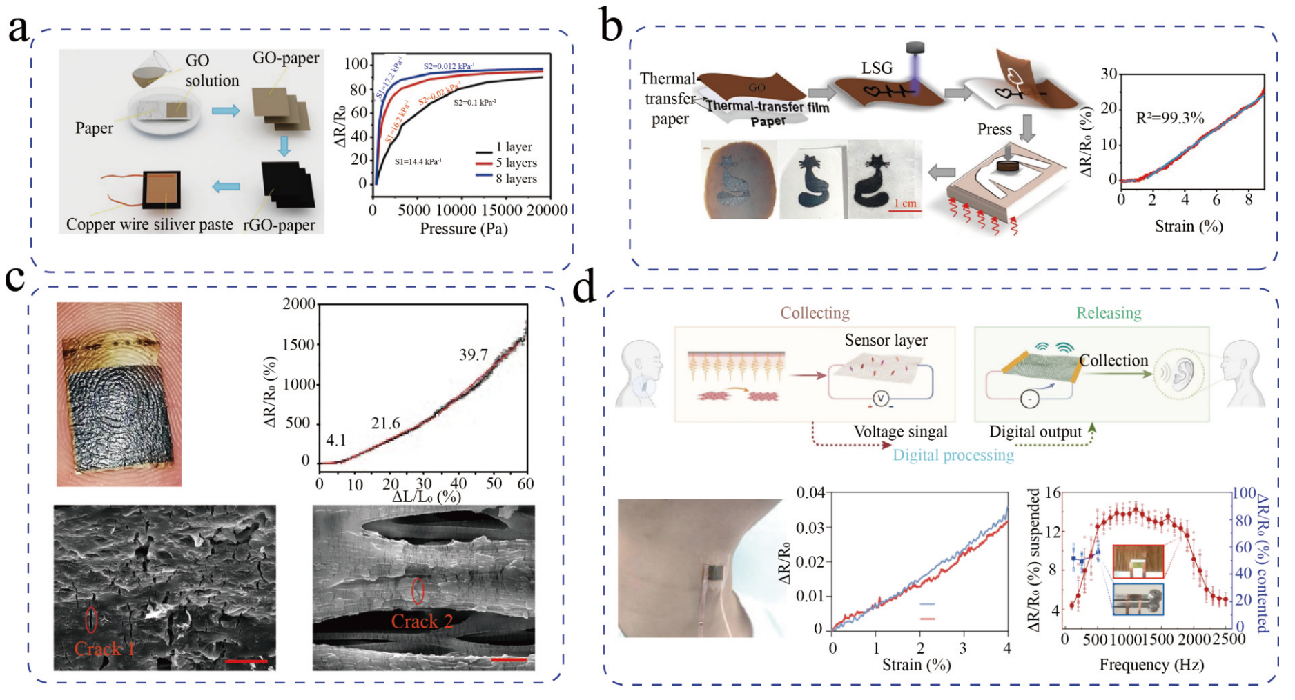 石墨烯柔性传感器的代表性研究进展。 图片涵盖了从基础的压力/应变检测到高级的语音交互应用,展示了石墨烯在制备灵活性和功能集成方面的巨大潜力。